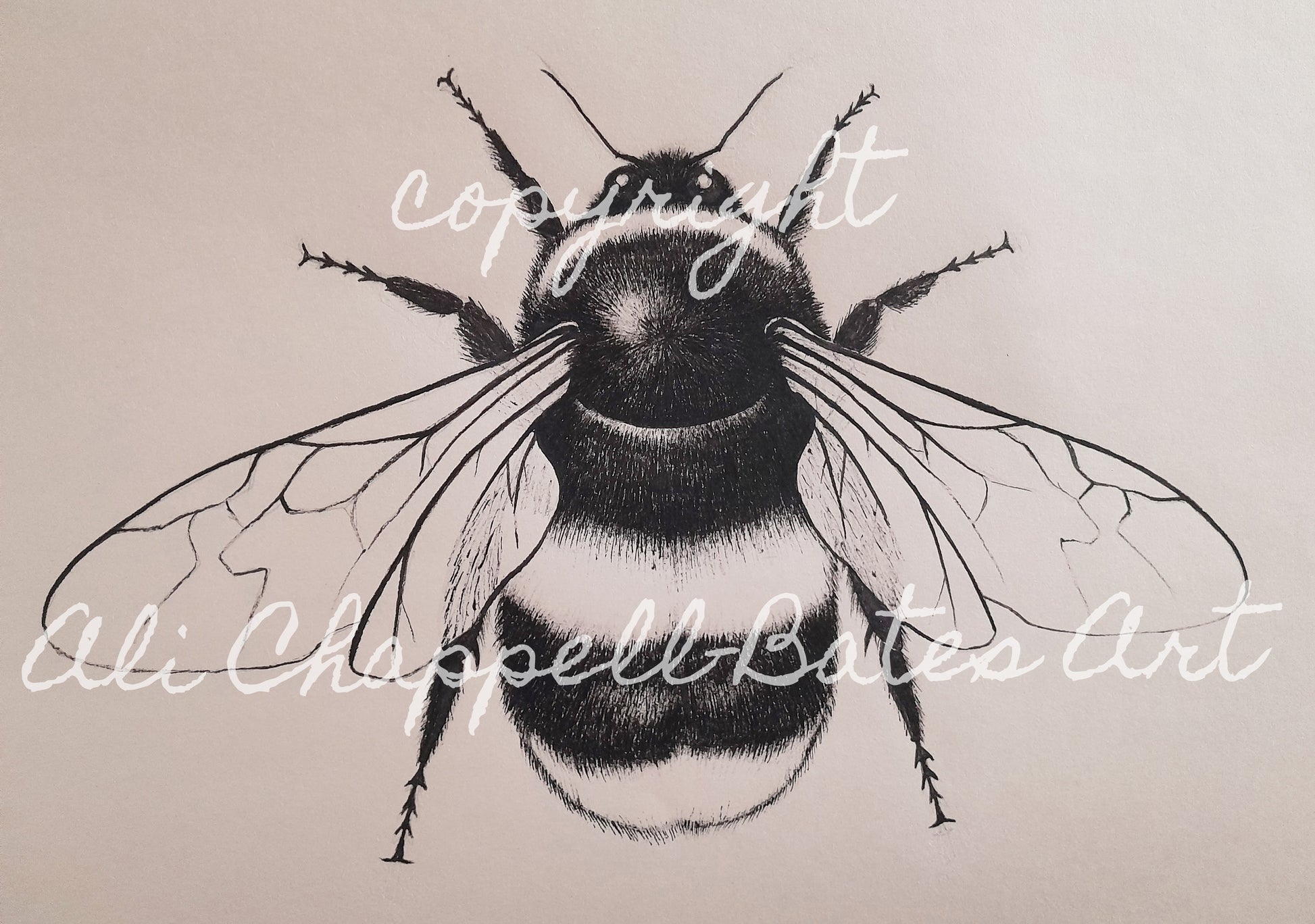 This is my original drawing of a Bumble Bee, drawn in Indian Ink using a Buddleia stick.
