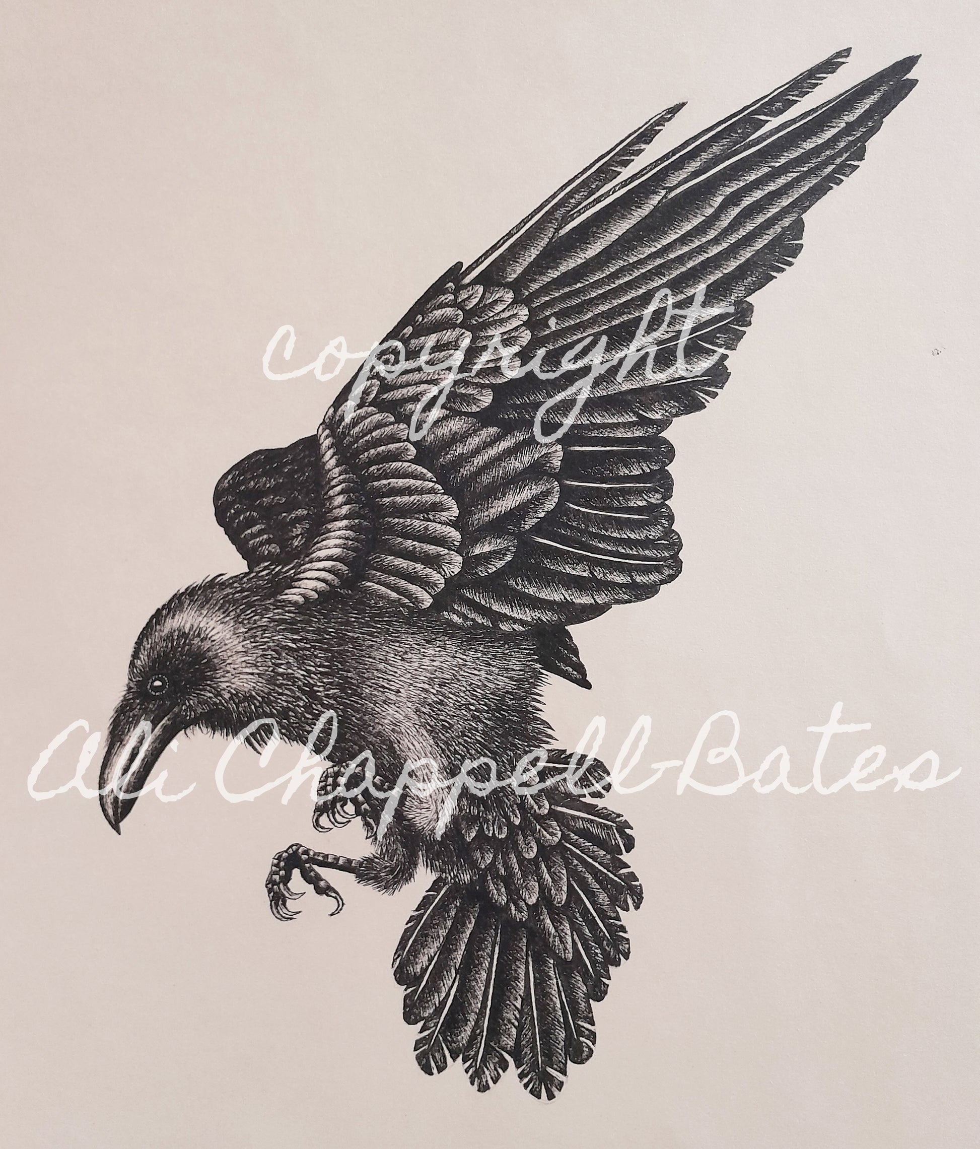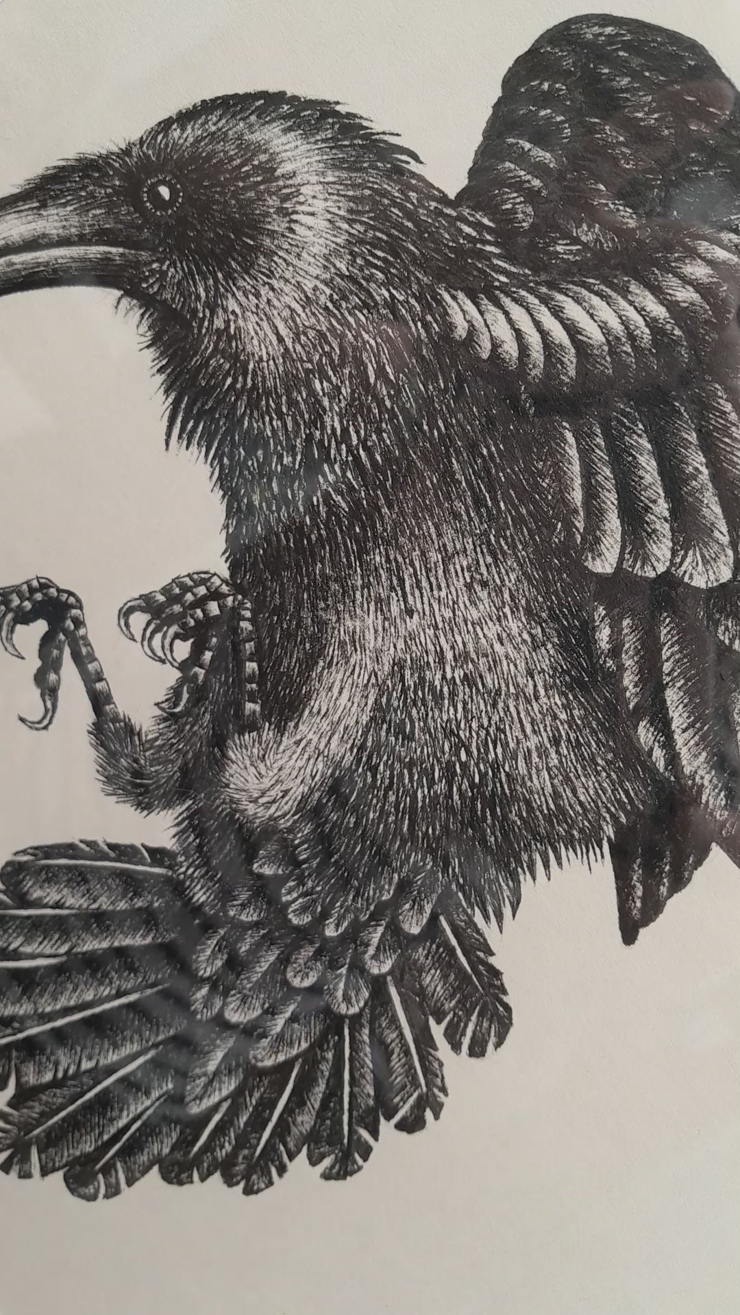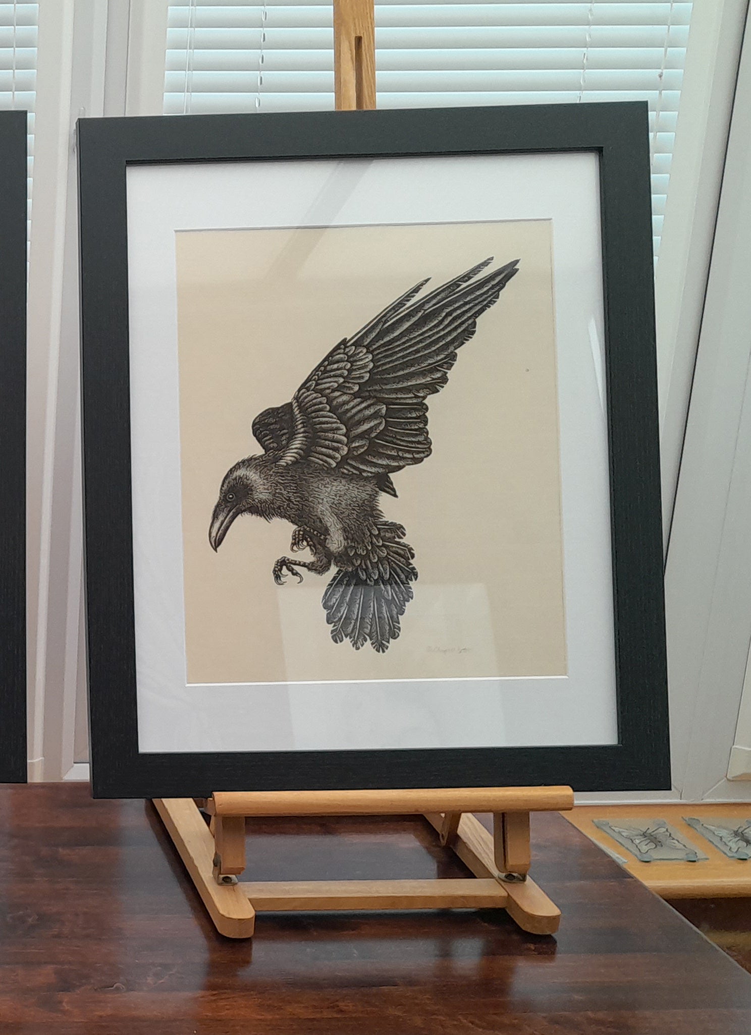 This is my original drawing of a Raven, drawn in Indian Ink using a Buddleia stick.